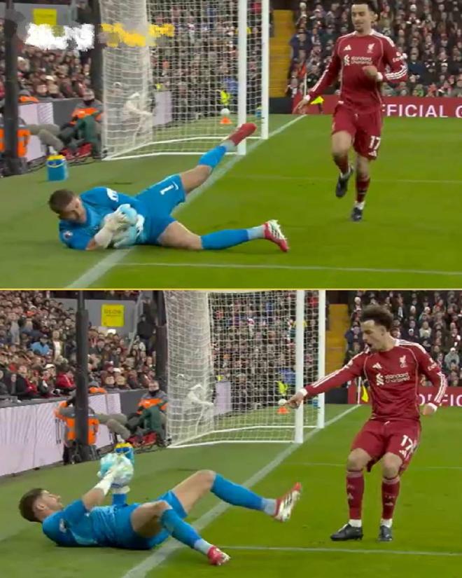 面对由本方球员触碰而来的皮球,维卡里奥不想给利物浦角球机会,于是选择纵身救球。然而,由于即将滑出禁区,维卡里奥不得不选择“急刹车”,但他在转身的过程中将球抱出了底线。从回放来看,这其实是利物浦一个明显的角球。