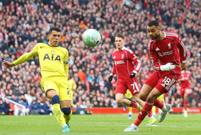 第21分钟,赫拉芬贝赫在禁区外尝试一脚远射,踢偏了。第33分钟,恩古莫哈在禁区左侧的射门被身前的防守球员挡了出去。3分钟后,加克波远射击中立柱弹出。热刺逃过一劫。第45分钟,里沙立松头球攻门,顶偏了。随后,里沙利松再次获得机会,再次头球攻门,这一次则被门将神扑化解。半场结束,利物浦1-0领先热刺。