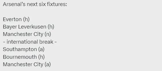 阿森纳未来6场比赛:主战埃弗顿、主战勒沃库森、联赛杯决赛对曼城、国际比赛日、客战南安普顿、主战伯恩茅斯、客战曼城。