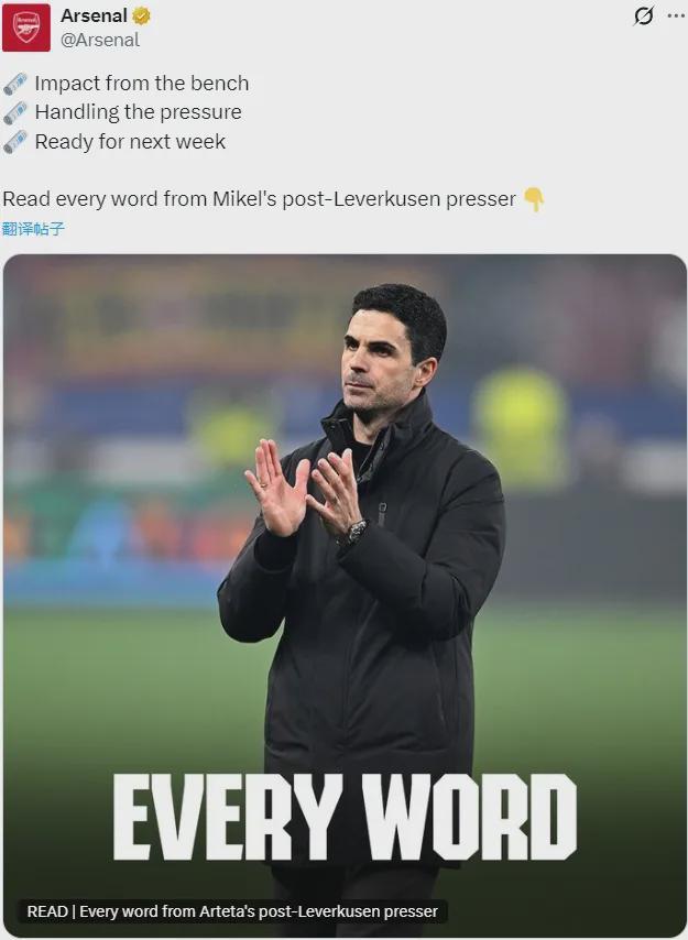 阿尔特塔出席了赛后新闻发布会,我们来看看阿森纳主帅的发言。