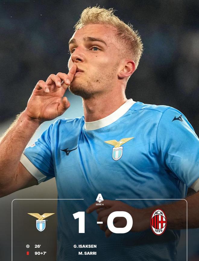 第26分钟,拉齐奥利用一次快速反击打破僵局。主队后场长传发动进攻,伊萨克森在与米兰后卫的身体对抗中占据优势,随后面对门将迈尼昂冷静小角度推射破门,拉齐奥取得1-0领先,这也是全场唯一进球。
