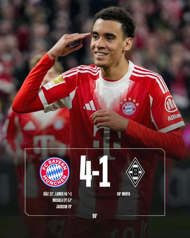 北京时间3月7日凌晨3点30分,德甲领头羊拜仁慕尼黑坐镇主场迎战门兴格拉德巴赫。上半场比赛,卡尔进球因越位在先被吹,格雷茨卡妙传迪亚斯先下一城,迪亚斯横传助攻莱默尔破门完成传射建功。易边再战,赖茨犯规吃到“红点套餐”,门兴少一人作战,穆西亚拉点射扩大比分,雅克松抢点破门锦上添花,终结自己联赛进球荒,穆赫亚补射扳回一球。最终,拜仁慕尼黑4比1大胜门兴格拉德巴赫,豪取德甲五连胜。