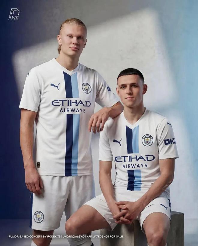 不过,报道称,获胜设计大概率会是一件经典的白色球衣,配有海军蓝和天蓝色的垂直条纹。有设计师根据该设计,PS出了曼城球员的上身图(上图)。
