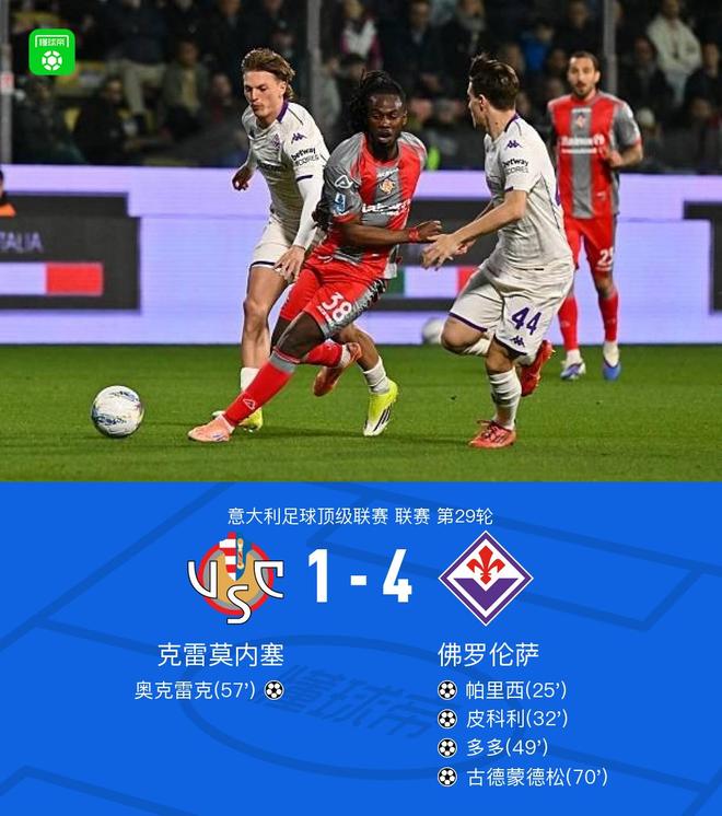 北京时间3月17日意大利足球甲级联赛第29轮,克雷莫内塞主场迎战佛罗伦萨。比赛中,佛罗伦萨率先凭借一次助攻由帕里西打入一球,随后又通过两次助攻分别由皮科利、多多接连破门;克雷莫内塞则依靠一次助攻由奥克雷克扳回一球,但佛罗伦萨此后再通过一次助攻由古德蒙德松完成破门。最终比分定格为克雷莫内塞1-4佛罗伦萨。