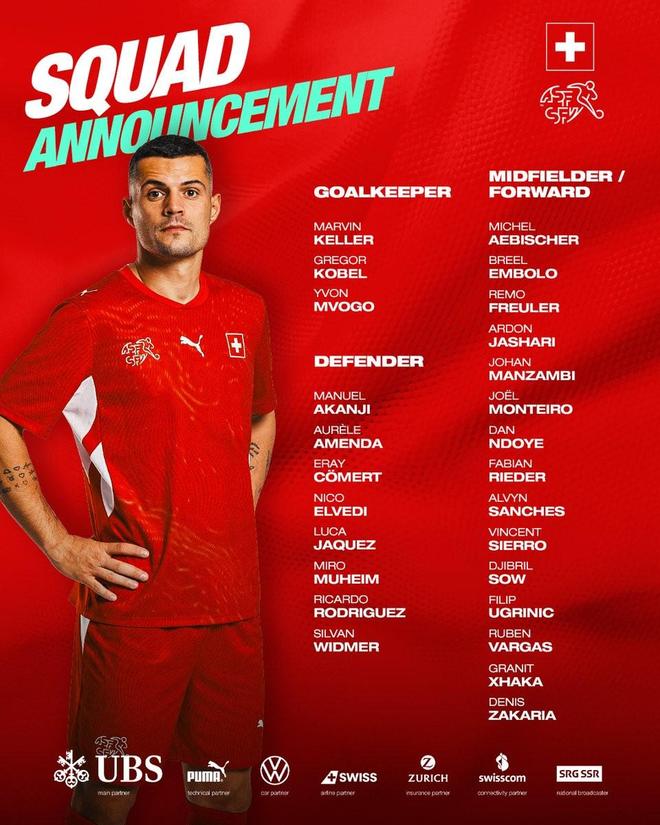 瑞士本期大名单:扎卡领衔,阿坎吉、科贝尔、巴尔加斯、恩多耶在列