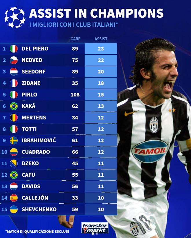 意甲球员欧冠历史助攻榜:皮耶罗、内德维德、西多夫前三