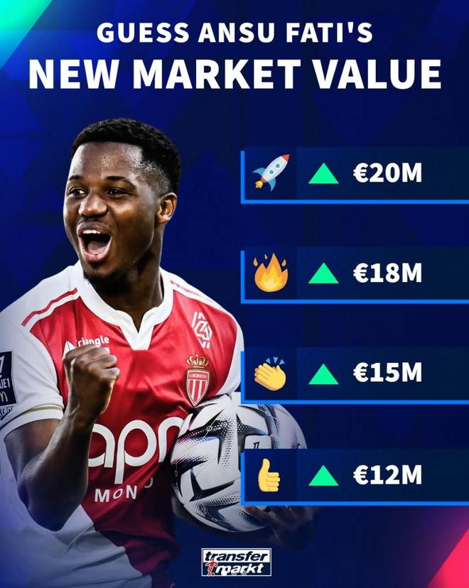 北京时间3月24日,德转预热了巴塞罗那外租摩纳哥的锋线球星安苏-法蒂的身价更新,他们给出了四个全部为上涨的选项,最高涨至2000万欧元。
